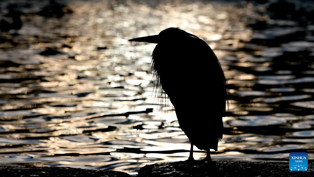 A grey heron stands beside a pond at London Zoo in London, Britain, Jan. 6, 2026. Amber cold weather alerts remain in force for England through Friday, with snow, ice, strong winds and heavy rain expected to bring further hazards later in the week. (Xinhua/Li Ying)