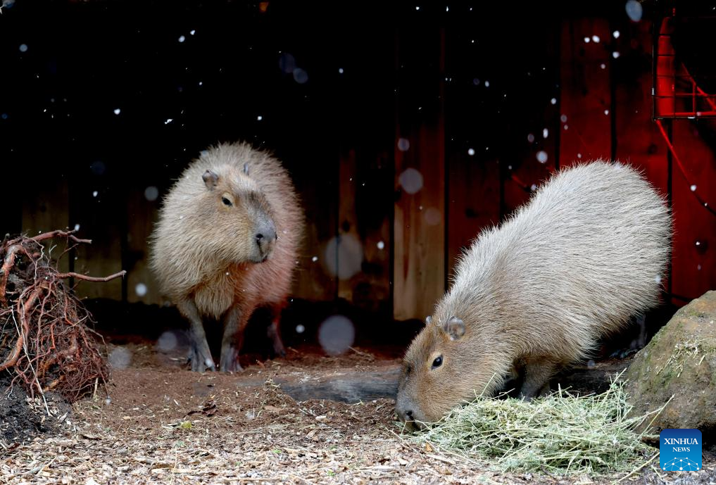 Two capybaras forage in the snow at London Zoo in London, Britain, Jan. 6, 2026. Amber cold weather alerts remain in force for England through Friday, with snow, ice, strong winds and heavy rain expected to bring further hazards later in the week. (Xinhua/Li Ying)