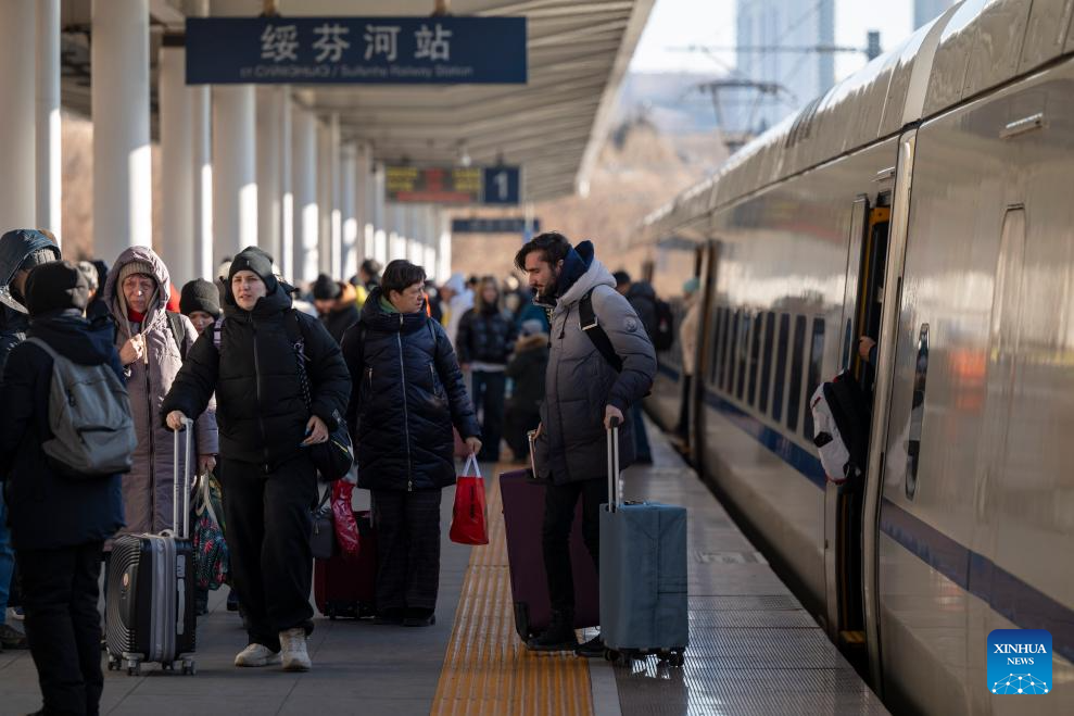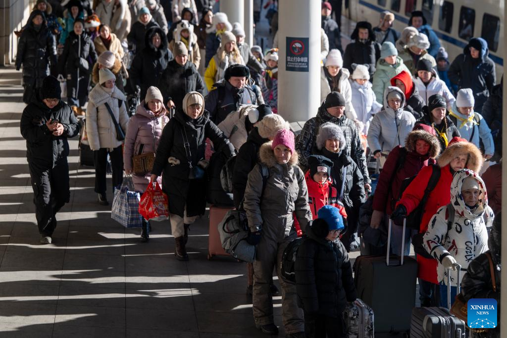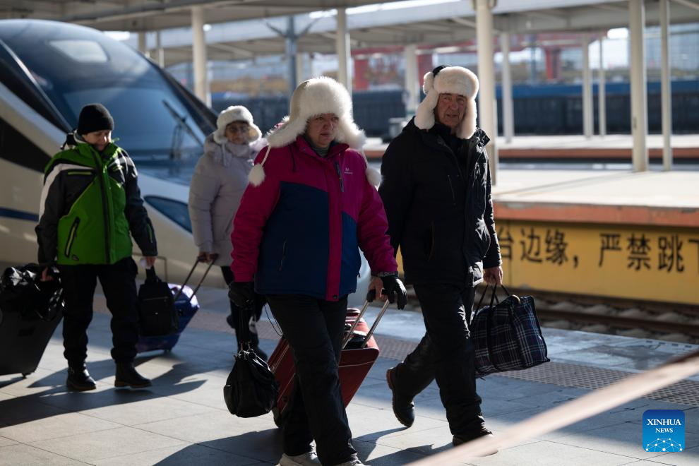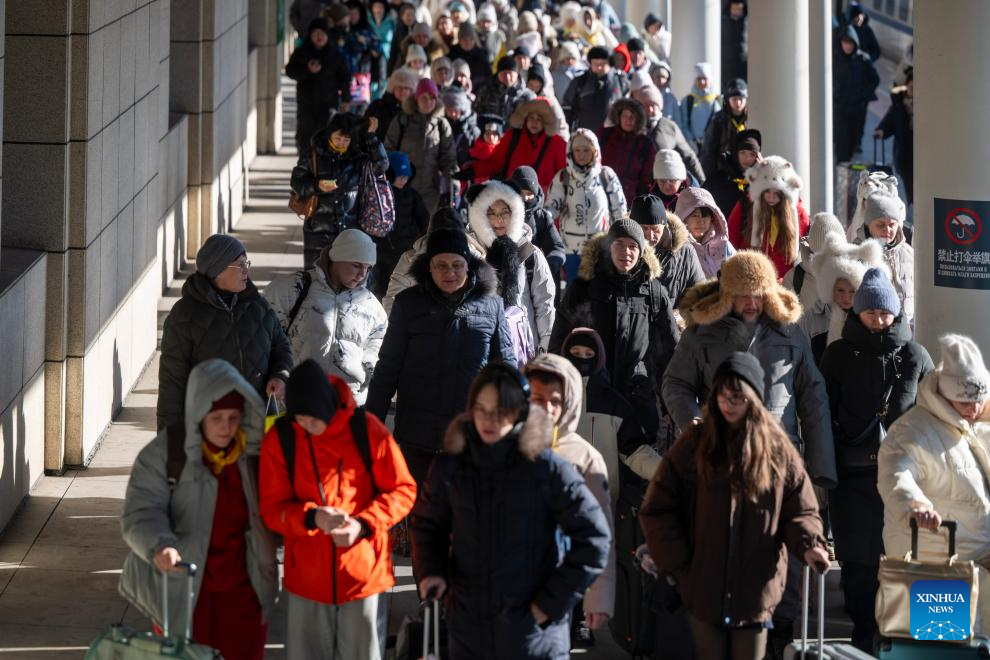 Tourists get off from a train at the platform of Suifenhe Railway Station in Suifenhe City, northeast China's Heilongjiang Province, on Jan. 8, 2026.