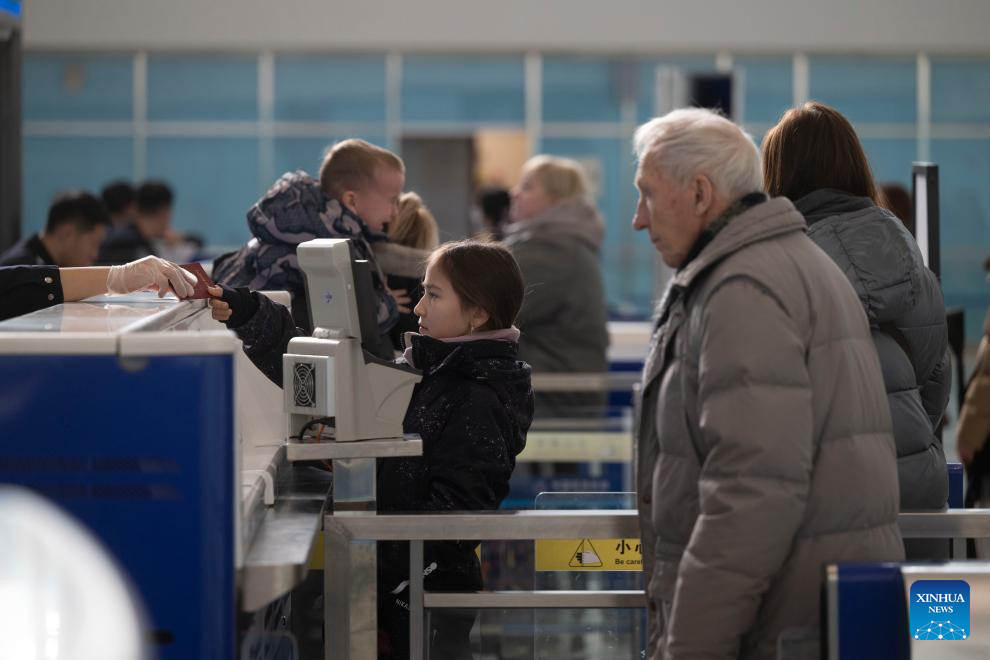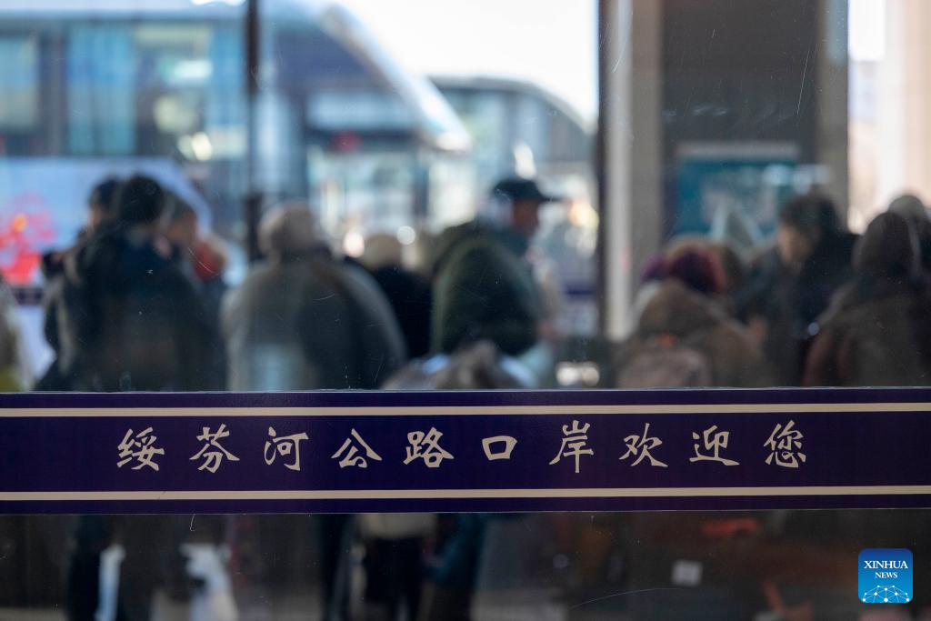 Tourists are pictured at a joint inspection hall of the Suifenhe highway port, in Suifenhe City, northeast China's Heilongjiang Province, on Jan. 8, 2026.