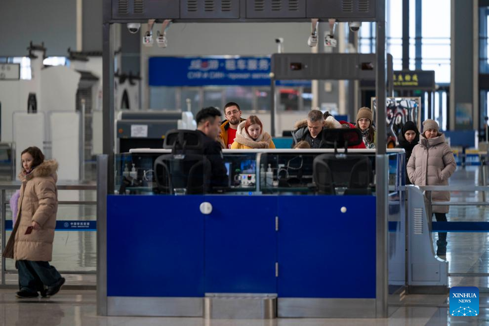 Upon the mutual visa exemption implementation, cross-border tourism has thrived between China and Russia. Statistics show that from Jan. 1 to Jan. 7 of 2026, the number of foreign tourists entering and leaving Suifenhe port reached 10,007, registering an increase of 83 percent year on year. (Xinhua/Zhang Tao)