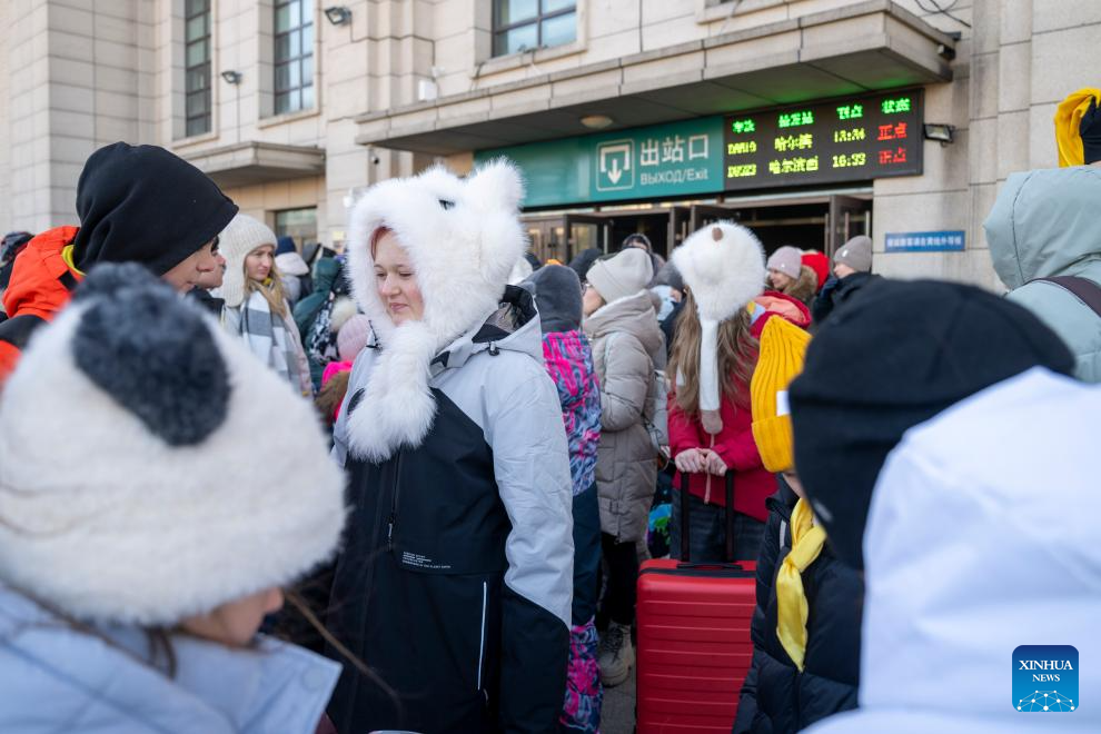 Tourists wait for the buses at the exit of Suifenhe Railway Station in Suifenhe City, northeast China's Heilongjiang Province, on Jan. 8, 2026.