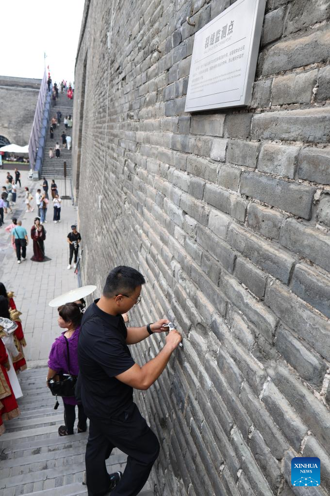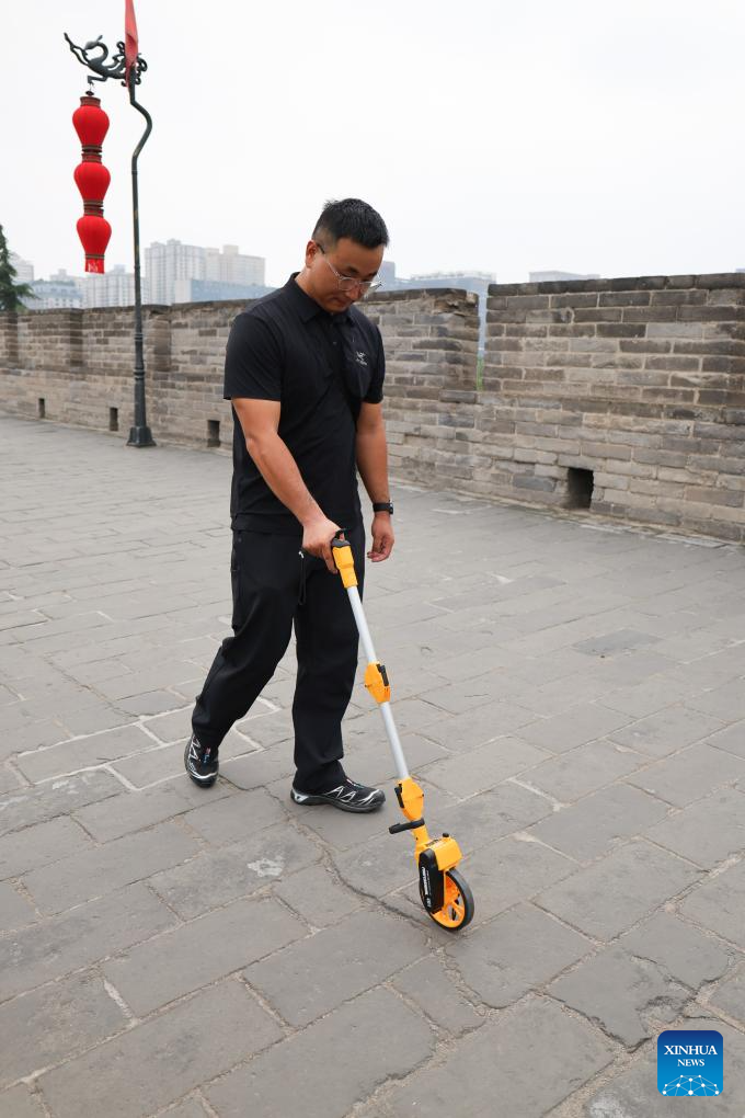 An inspector measures the length of a crack on Xi'an City Wall in Xi'an, northwest China's Shaanxi Province, Sept. 10, 2025. (Xinhua/Zhu Weixi)