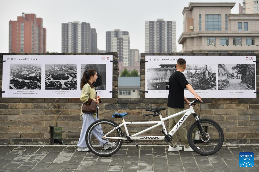 Tourists visit a photo exhibition themed on the city wall protection on the Xi'an City Wall in Xi'an, northwest China's Shaanxi Province, Sept. 10, 2025. (Xinhua/Shao Rui)