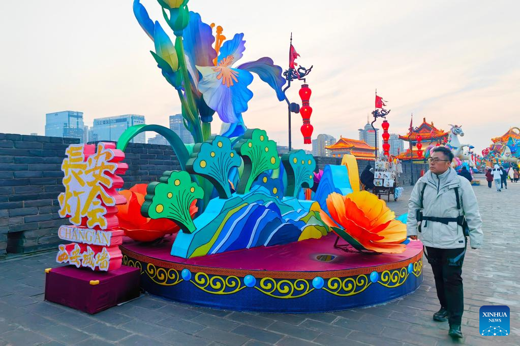 Zhao Bin walks on the Xi'an City Wall with an exoskeleton robot during the New Year holiday in Xi'an, northwest China's Shaanxi Province, Jan. 4, 2026. (Xinhua)