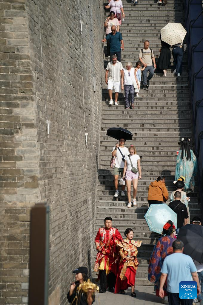 Tourists visit the Xi'an City Wall in Xi'an, northwest China's Shaanxi Province, Sept. 10, 2025. (Xinhua/Shao Rui)