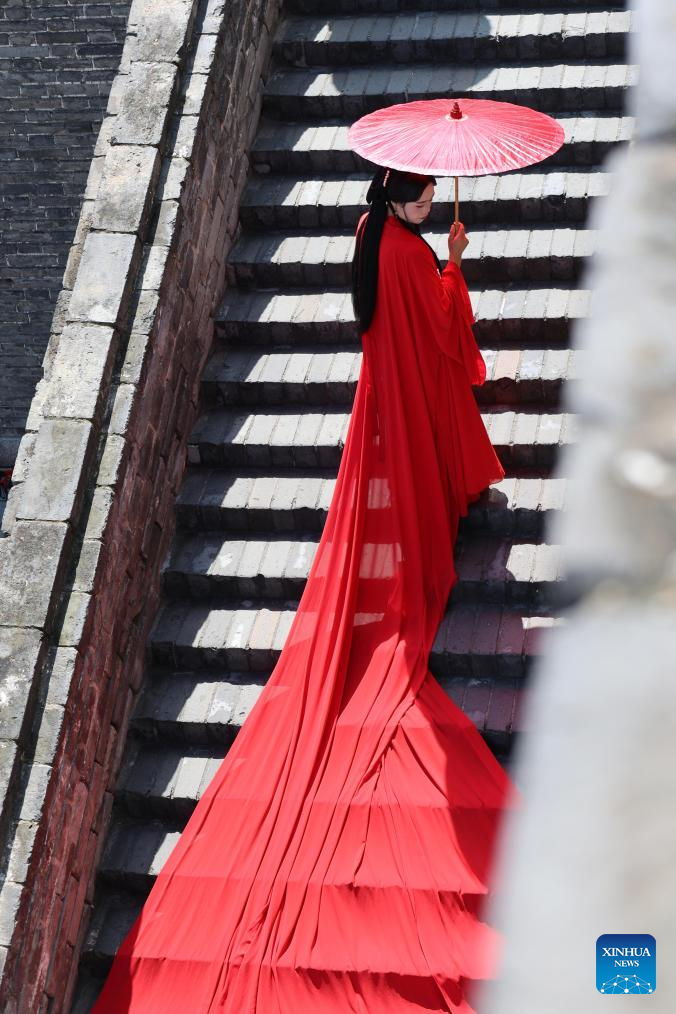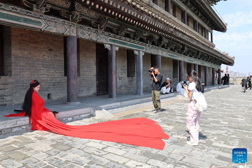 A tourist poses for photos on the Xi'an City Wall in Xi'an, northwest China's Shaanxi Province, Sept. 12, 2025. (Xinhua/Zhu Weixi)