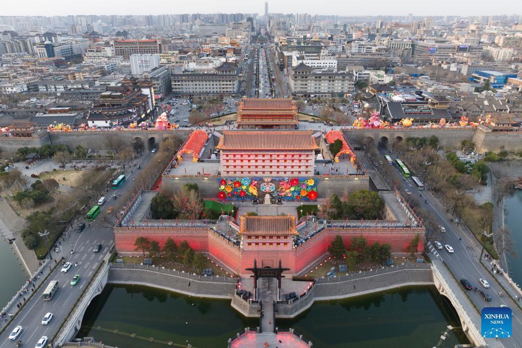 An aerial drone photo taken on March 19, 2025 shows the Yongning Gate of the Xi'an City Wall in Xi'an, northwest China's Shaanxi Province. (Xinhua/Shao Rui)