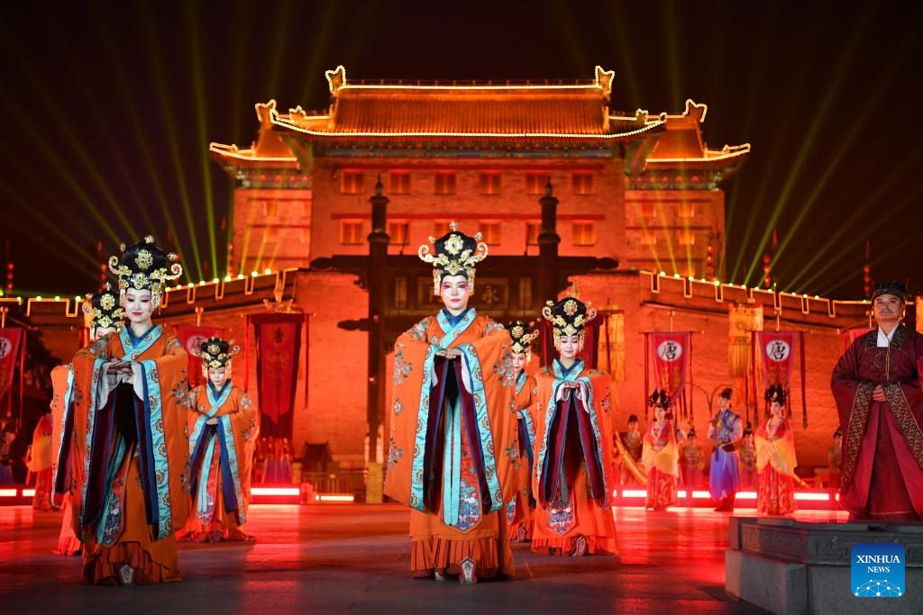 This file photo taken on Oct. 14, 2024 shows artists performing outside the Yongning Gate of the Xi'an City Wall in Xi'an, northwest China's Shaanxi Province. (Xinhua/Shao Rui)