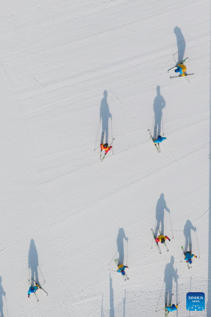 An aerial drone photo taken on Jan. 7, 2026 shows tourists skiing at the Guangwu international ski resort in Shanyin County of Shuozhou, north China's Shanxi Province. Shanyin County has been leveraging its geographical advantage to develop ice and snow-themed tourism, which is now a new driver for the local economy. (Xinhua/Yang Chenguang)