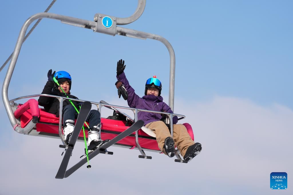 Tourists take a ski lift at the Guangwu international ski resort in Shanyin County of Shuozhou, north China's Shanxi Province, Jan. 7, 2026. Shanyin County has been leveraging its geographical advantage to develop ice and snow-themed tourism, which is now a new driver for the local economy. (Xinhua/Yang Chenguang)
