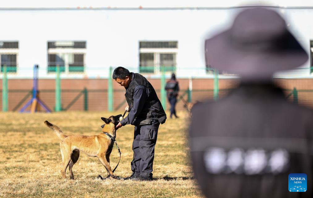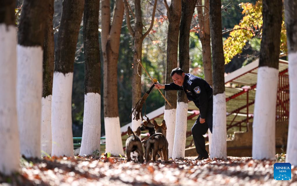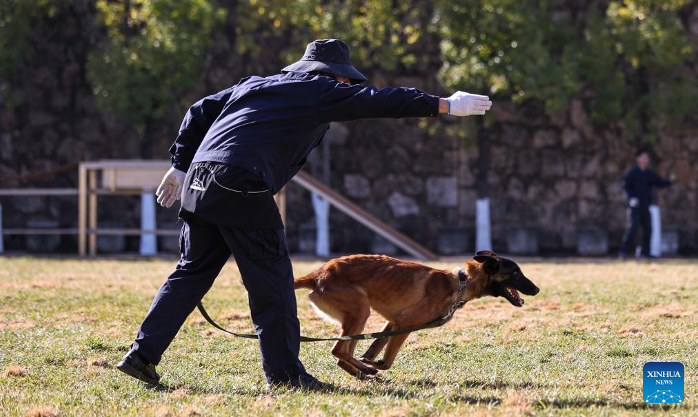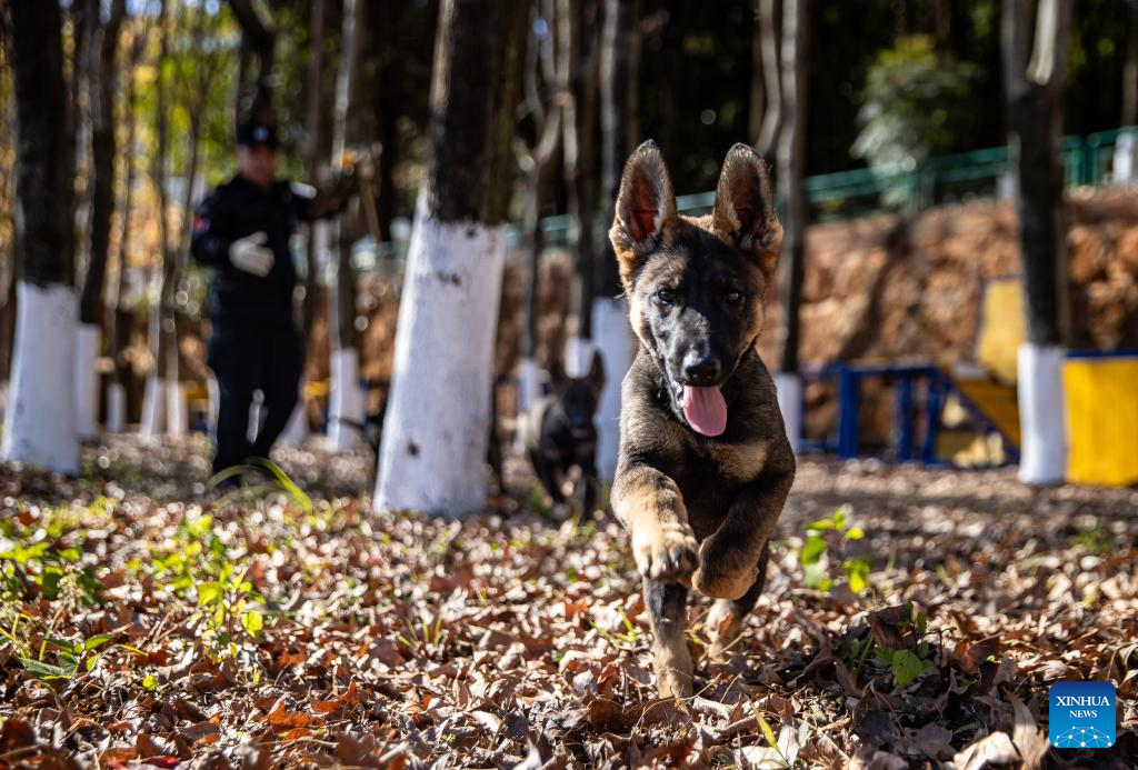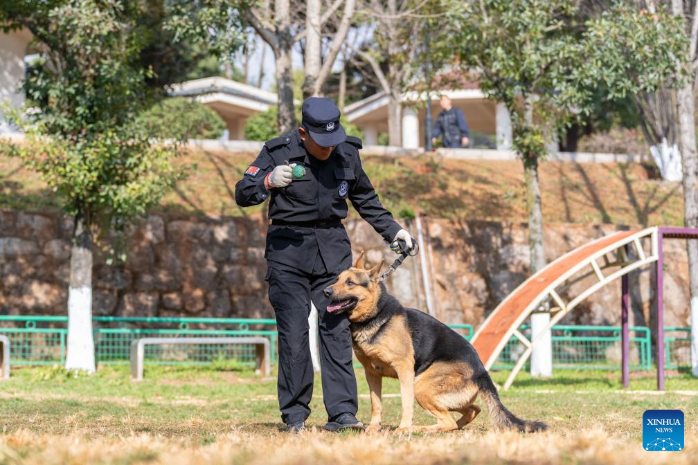 A police dog trainer trains a Kunming dog in explosive detection at the Ministry of Public Security's Kunming police dog base in Kunming, southwest China's Yunnan Province, Dec. 29, 2025.