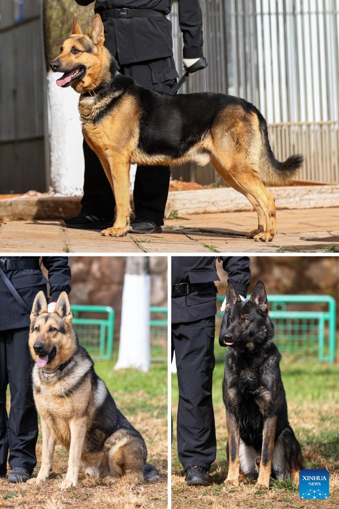 This combo photo taken by Xinhua journalists Jiang Wenyao and Gao Yongwei shows Kunming dogs at the Ministry of Public Security's Kunming police dog base in Kunming, southwest China's Yunnan Province, Jan. 5, 2026.