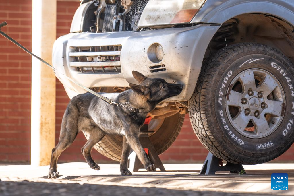 A Kunming dog undergoes a drug searching training at the Ministry of Public Security's Kunming police dog base in Kunming, southwest China's Yunnan Province, Jan. 5, 2026.