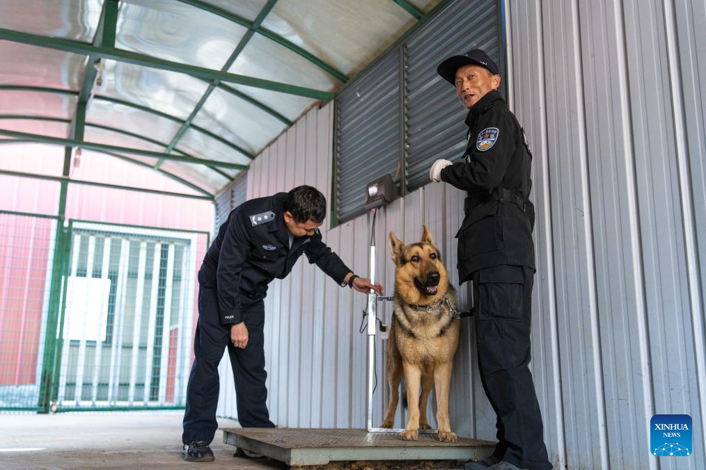 Police dog trainers weigh a Kunming dog at the Ministry of Public Security's Kunming police dog base in Kunming, southwest China's Yunnan Province, Jan. 5, 2026.