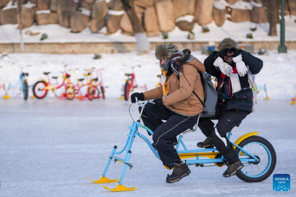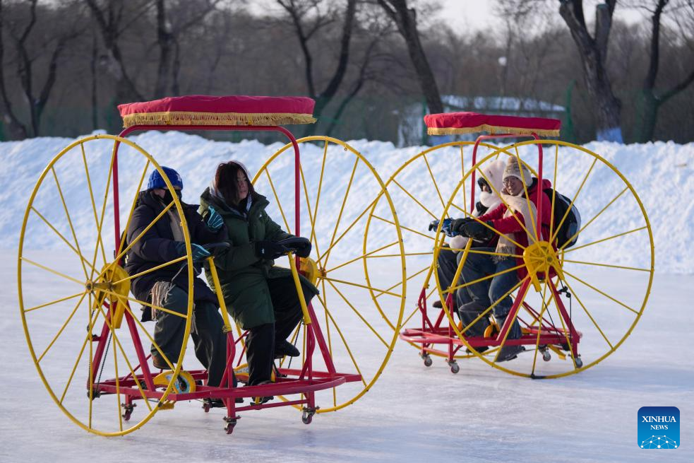 Foreign tourists ride on ice while visiting the 38th Sun Island International Snow Sculpture Art Expo in Harbin, northeast China's Heilongjiang Province, Jan. 8, 2026.