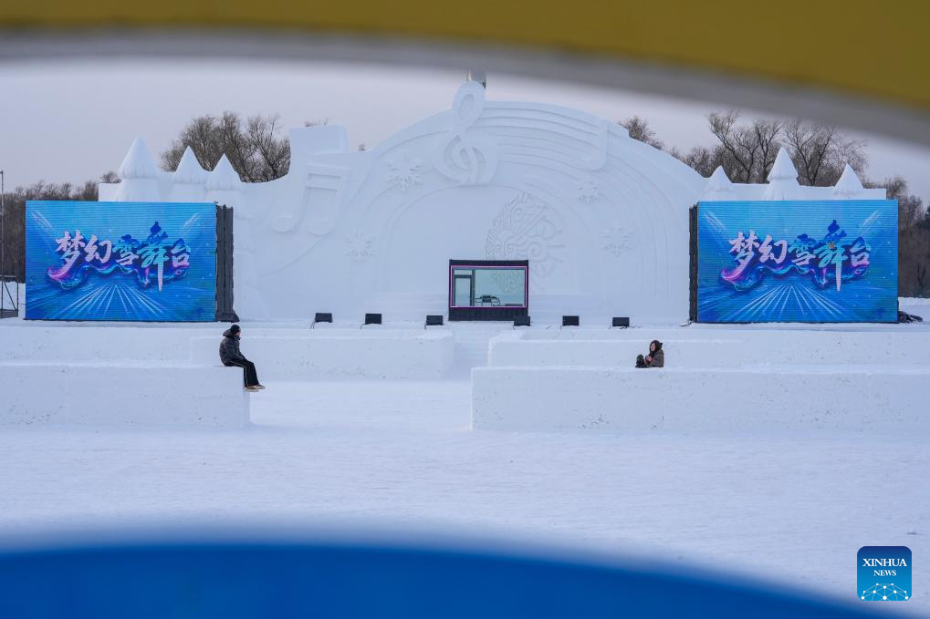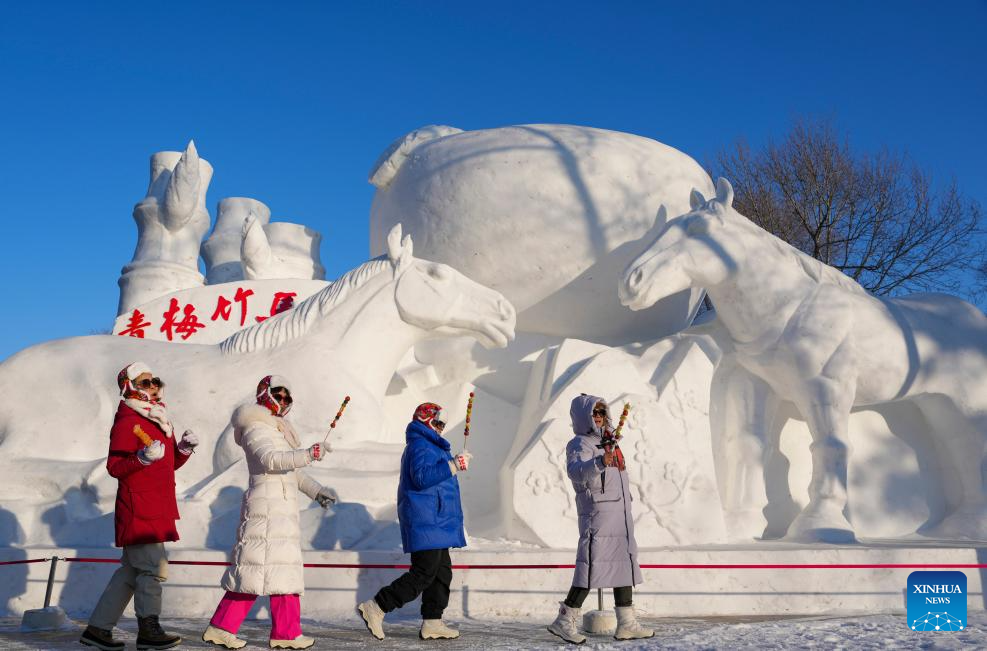 The ongoing snow sculpture art expo, with an exhibition area of 1.5 million square meters, is attracting visitors to its stunning ice and snow landscapes. (Xinhua/Wang Jianwei)