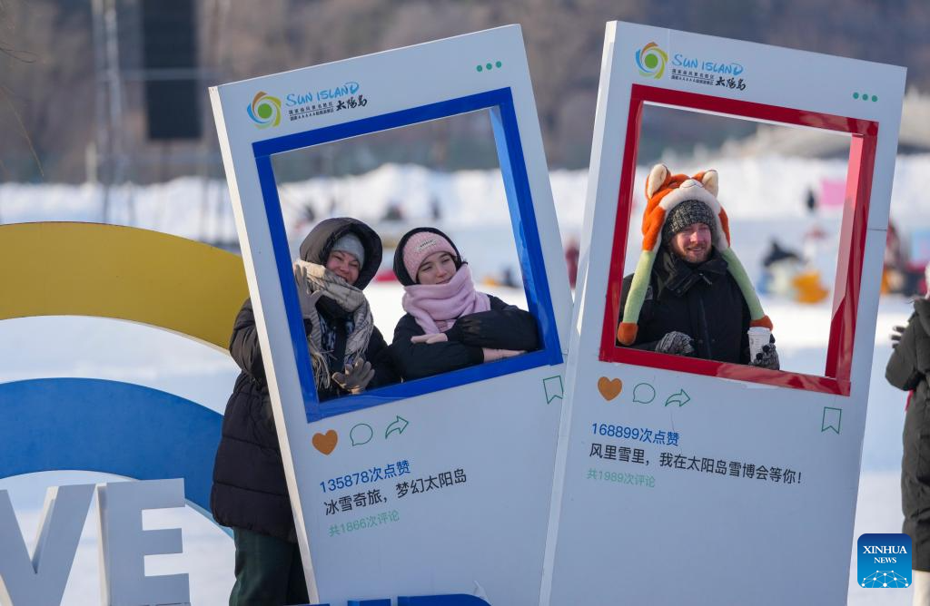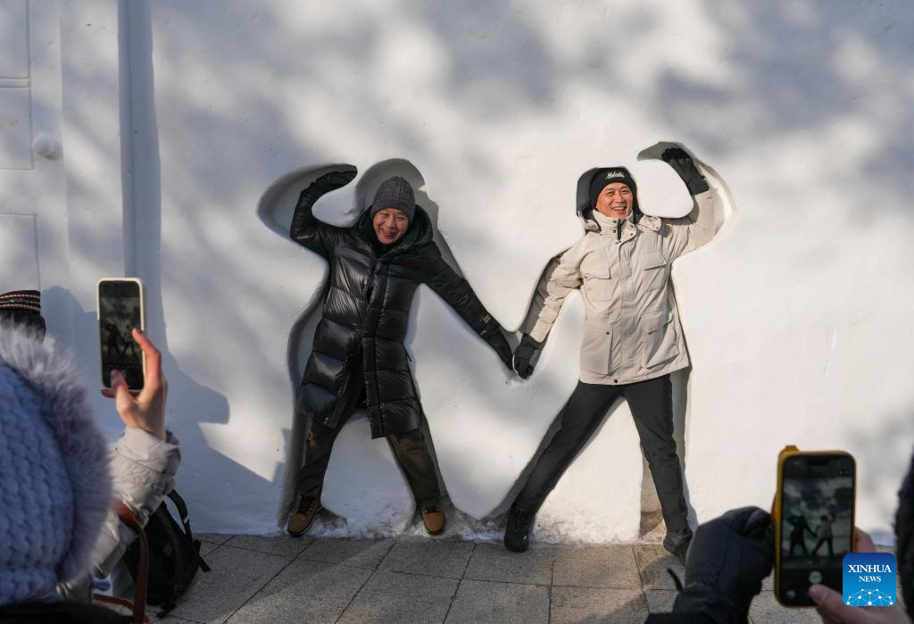 Foreign tourists pose for photos while visiting the 38th Sun Island International Snow Sculpture Art Expo in Harbin, northeast China's Heilongjiang Province, Jan. 8, 2026.