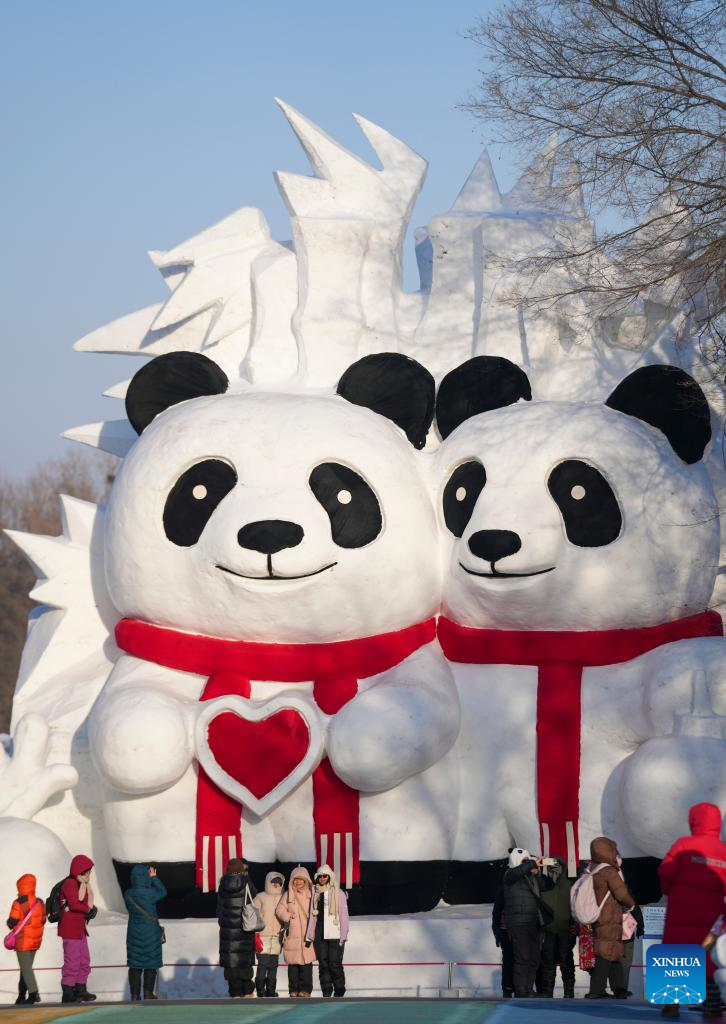 Tourists take photos with giant panda-shaped snow sculptures while visiting the 38th Sun Island International Snow Sculpture Art Expo in Harbin, northeast China's Heilongjiang Province, Jan. 8, 2026.