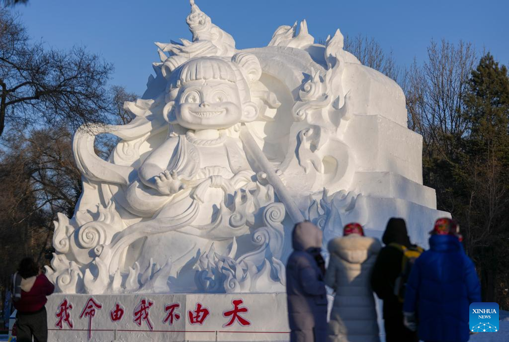 Tourists take photos of a snow sculpture featuring Ne Zha, a character from Chinese mythology, while visiting the 38th Sun Island International Snow Sculpture Art Expo in Harbin, northeast China's Heilongjiang Province, Jan. 7, 2026.