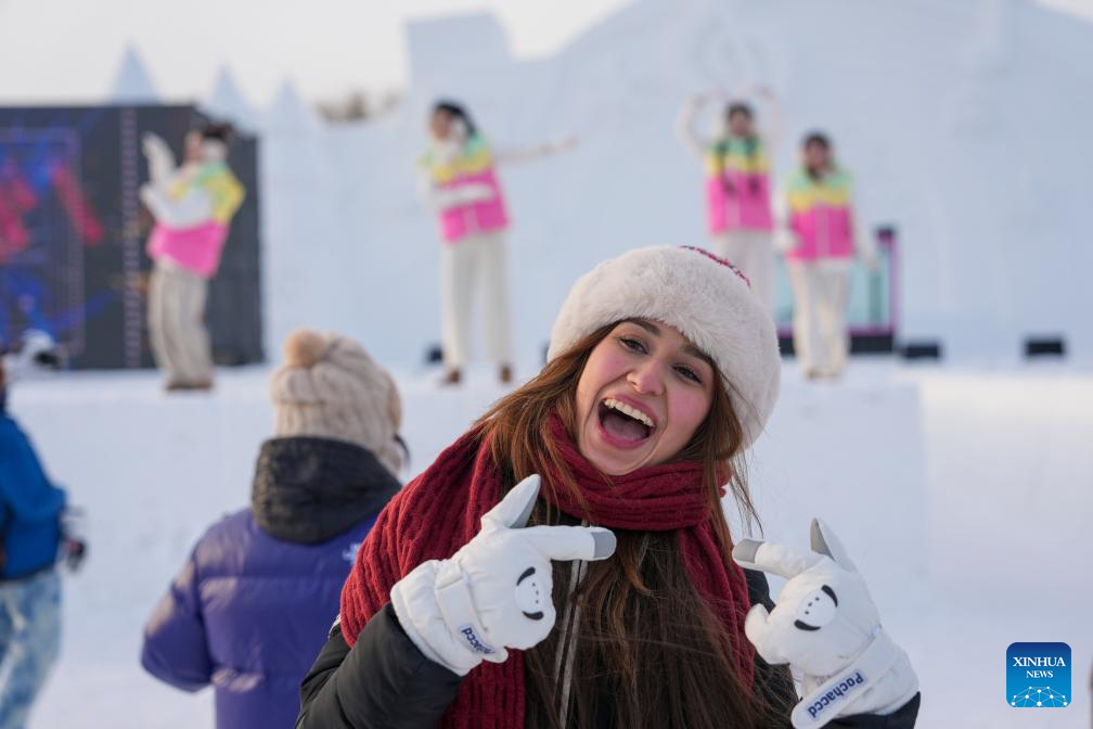 A foreign tourist dances to the music while visiting the 38th Sun Island International Snow Sculpture Art Expo in Harbin, northeast China's Heilongjiang Province, Jan. 8, 2026.