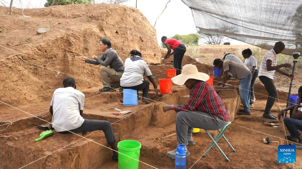 This undated file photo shows China-Kenya joint archaeological team working at Kenya's Lake Bogoria site. A China-Kenya joint archaeological team has for the first time unearthed stone tool products featuring blade technology from the middle to late Paleolithic period at Kenya's Lake Bogoria site. The discovery, announced at a conference on the 2025 archaeological results of central China's Henan Province held from Wednesday to Saturday, provides crucial material for studying the origins and spread of blade technology and its connection to early modern humans. (Xinhua)