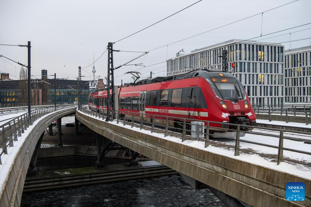 A train arrives at the main train station in Berlin, capital of Germany, Jan. 9, 2026. Winter Storm Elli swept across large parts of Germany on Friday, killing at least three people and severely disrupting transport, schools and public services, particularly in the country's north. (Xinhua/Zhang Haofu)
