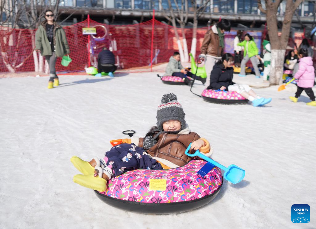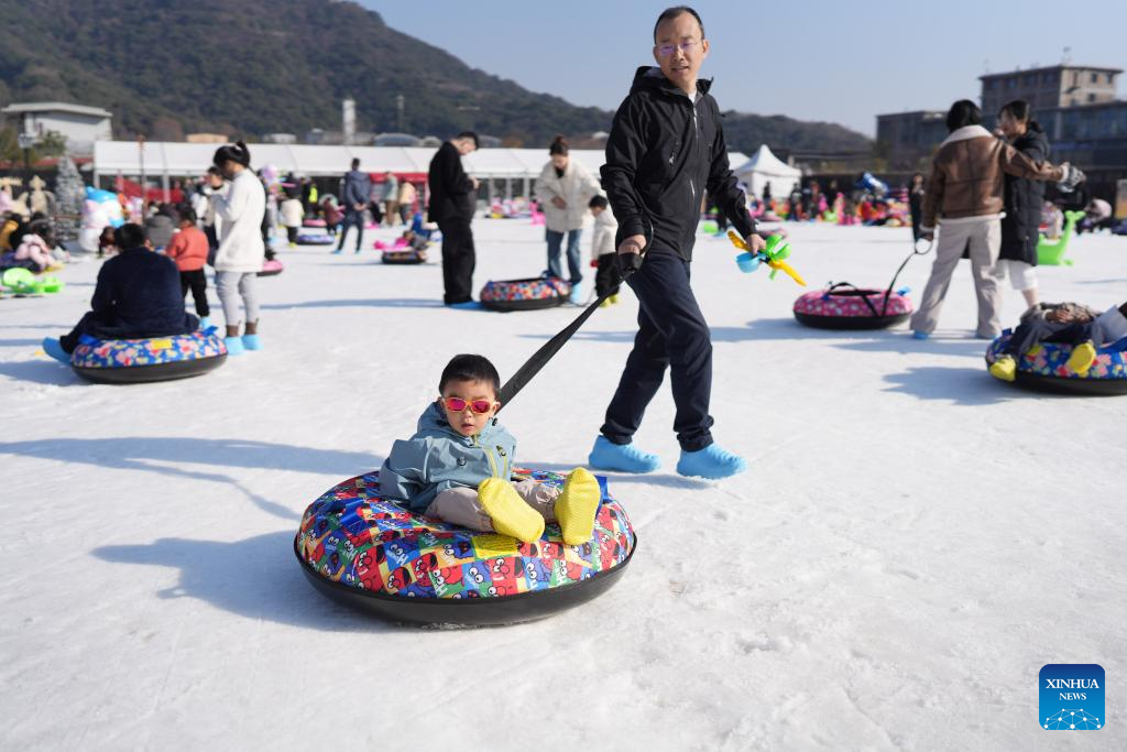 People enjoy themselves at an ice and snow carnival in Hangzhou, east China's Zhejiang Province, Jan. 9, 2026. An ice and snow carnival kicked off at the Hangzhou grand canal steelworks park on Friday, attracting visitors across the city.