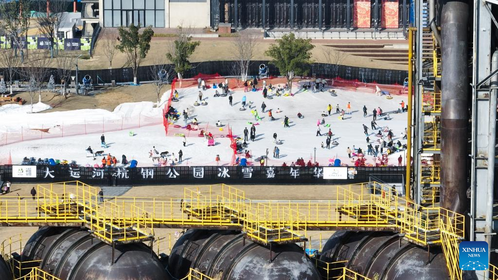 A drone photo taken on Jan. 9, 2026 shows people enjoying themselves at an ice and snow carnival in Hangzhou, east China's Zhejiang Province. An ice and snow carnival kicked off at the Hangzhou grand canal steelworks park on Friday, attracting visitors across the city.
