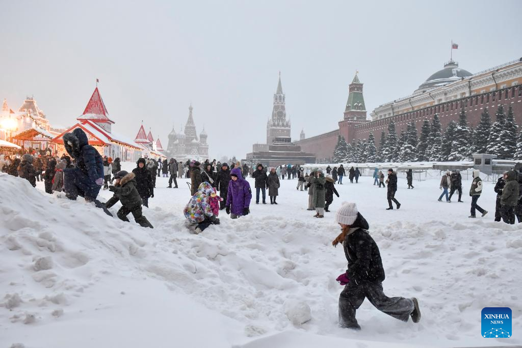 People visit snow-covered Red Square in Moscow, Russia, Jan. 9, 2026. (Photo by Alexander Zemlianichenko Jr/Xinhua)