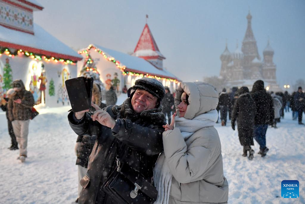 People take a selfie at snow-covered Red Square in Moscow, Russia, Jan. 9, 2026. (Photo by Alexander Zemlianichenko Jr/Xinhua)