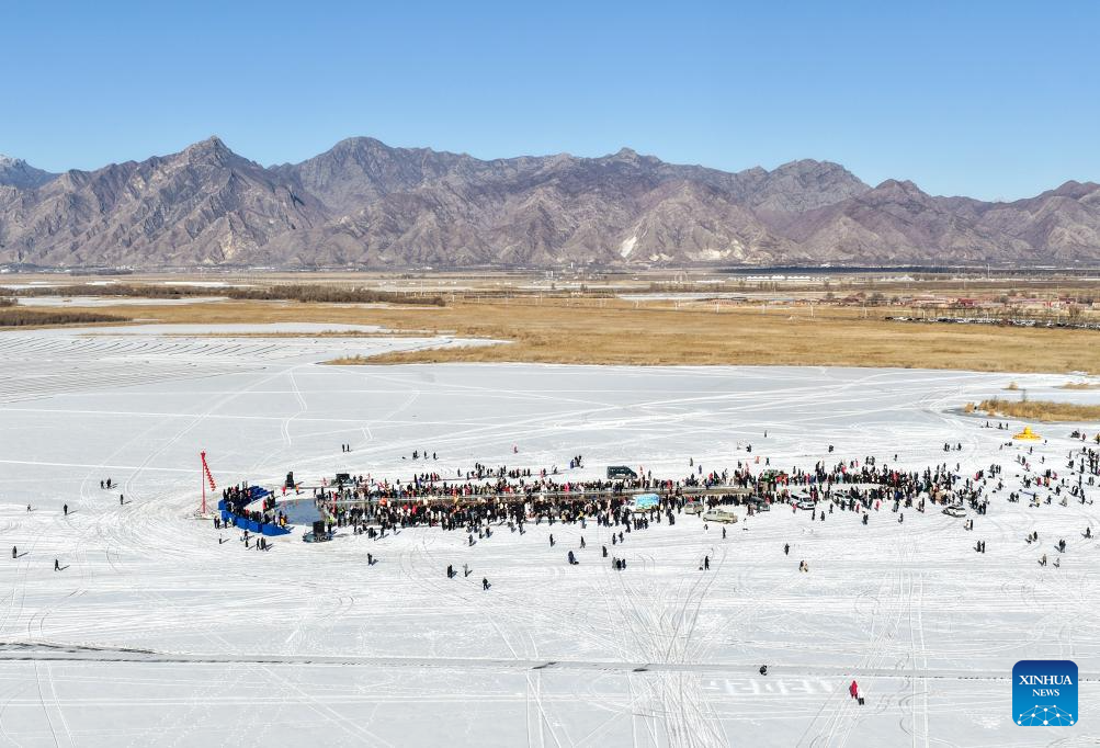 An aerial drone photo shows people attending the 4th Hasuhai Lake winter fishing festival in Tumd Left Banner of Hohhot, north China's Inner Mongolia Autonomous Region, Jan. 10, 2026. The 4th Hasuhai Lake winter fishing festival opened in Tumd Left Banner of Hohhot on Saturday. The activity features ice and snow entertainment, hot spring experience, delicious food and folk shows, attracting many citizens and tourists. (Xinhua/Lian Zhen)