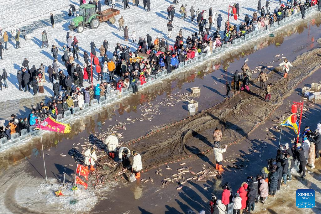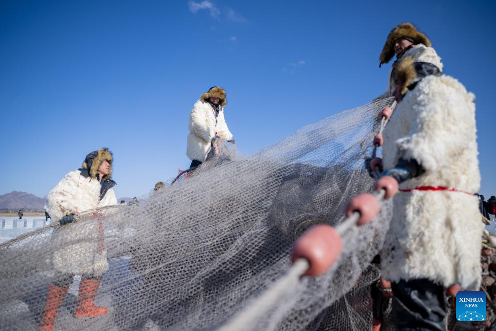 Fishermen haul the fishing net during the 4th Hasuhai Lake winter fishing festival in Tumd Left Banner of Hohhot, north China's Inner Mongolia Autonomous Region, Jan. 10, 2026. The 4th Hasuhai Lake winter fishing festival opened in Tumd Left Banner of Hohhot on Saturday. The activity features ice and snow entertainment, hot spring experience, delicious food and folk shows, attracting many citizens and tourists. (Xinhua/Lian Zhen)