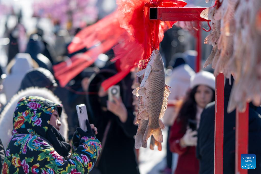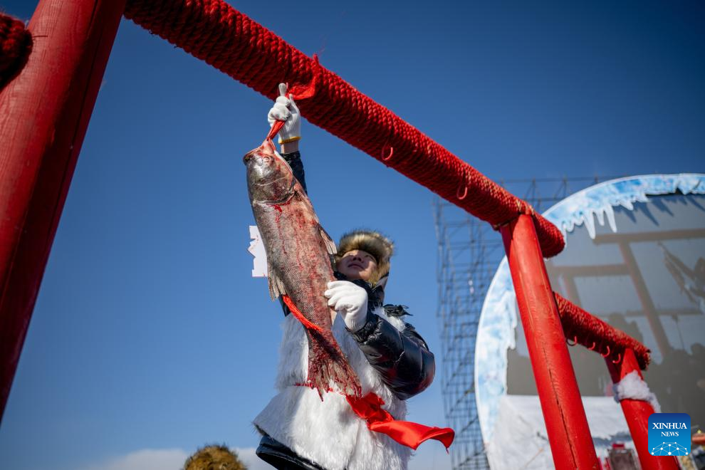 A fisherman hangs a fish for auction during the 4th Hasuhai Lake winter fishing festival in Tumd Left Banner of Hohhot, north China's Inner Mongolia Autonomous Region, Jan. 10, 2026. The 4th Hasuhai Lake winter fishing festival opened in Tumd Left Banner of Hohhot on Saturday. The activity features ice and snow entertainment, hot spring experience, delicious food and folk shows, attracting many citizens and tourists. (Xinhua/Lian Zhen)