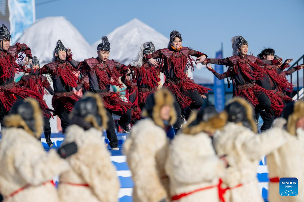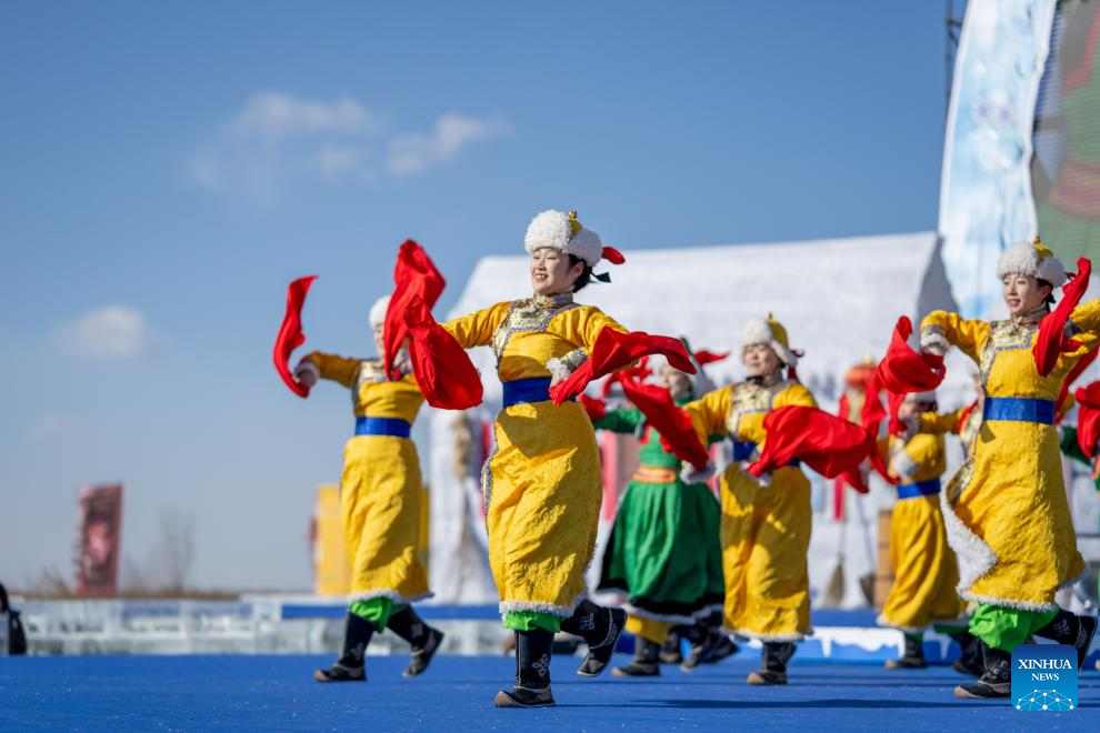 Actors perform during the opening ceremony of the 4th Hasuhai Lake winter fishing festival in Tumd Left Banner of Hohhot, north China's Inner Mongolia Autonomous Region, Jan. 10, 2026. The 4th Hasuhai Lake winter fishing festival opened in Tumd Left Banner of Hohhot on Saturday. The activity features ice and snow entertainment, hot spring experience, delicious food and folk shows, attracting many citizens and tourists. (Xinhua/Lian Zhen)