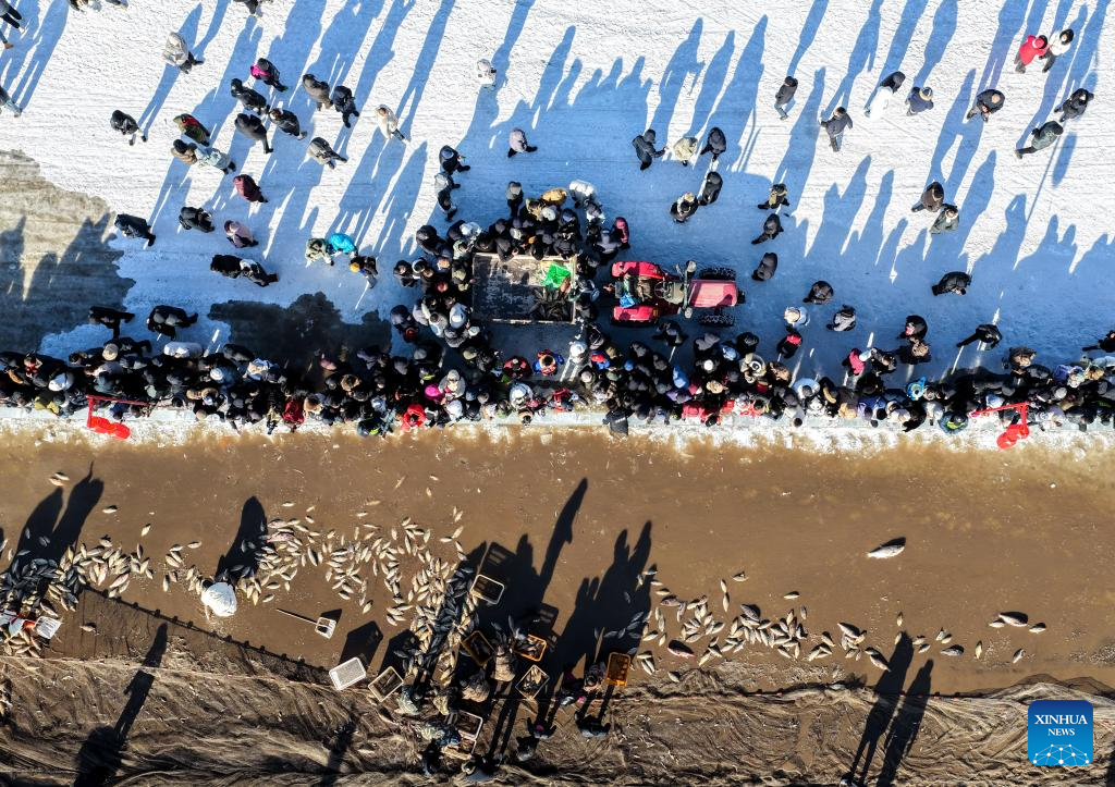People take photos of fish for auction during the 4th Hasuhai Lake winter fishing festival in Tumd Left Banner of Hohhot, north China's Inner Mongolia Autonomous Region, Jan. 10, 2026. The 4th Hasuhai Lake winter fishing festival opened in Tumd Left Banner of Hohhot on Saturday. The activity features ice and snow entertainment, hot spring experience, delicious food and folk shows, attracting many citizens and tourists. (Xinhua/Lian Zhen)