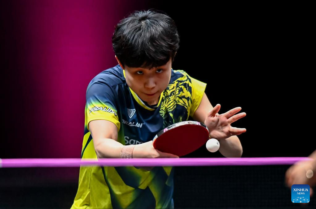 Joo Cheonhui of South Korea hits a return during the women's singles Round of 16 match against Chen Xingtong of China at the WTT Champions Doha 2026 in Doha, Qatar, on Jan. 9, 2026. (Photo by Nikku/Xinhua)
