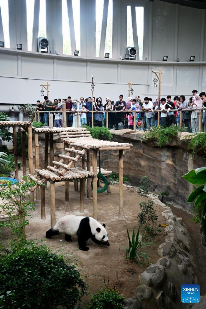 People view giant panda "Chenxing" at Zoo Negara in Selangor, Malaysia, on Jan. 10, 2026. China's giant pandas "Chenxing" and "Xiaoyue," currently on loan to Malaysia, officially met the public here on Saturday.(Xinhua/Cheng Yiheng)
