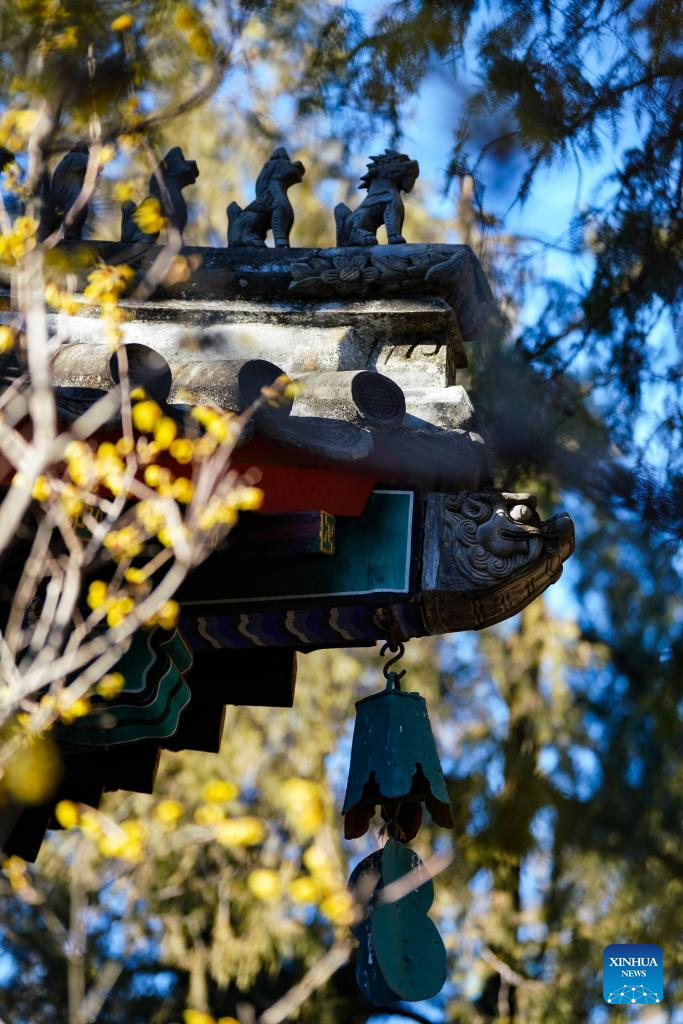 This photo taken on Jan. 10, 2026 shows wintersweet blossoms at the Wofo Temple in Beijing, capital of China. (Xinhua/Fan Yuqing)