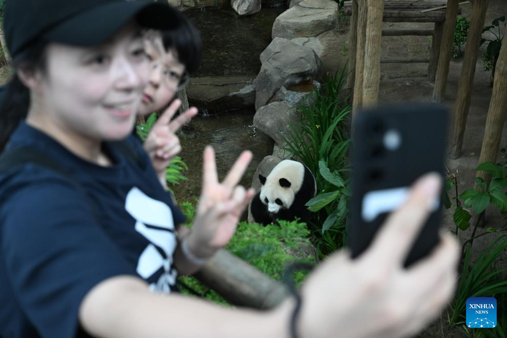 People pose for selfies with giant panda "Xiaoyue" at Zoo Negara in Selangor, Malaysia, on Jan. 10, 2026. China's giant pandas "Chenxing" and "Xiaoyue," currently on loan to Malaysia, officially met the public here on Saturday.(Xinhua/Cheng Yiheng)