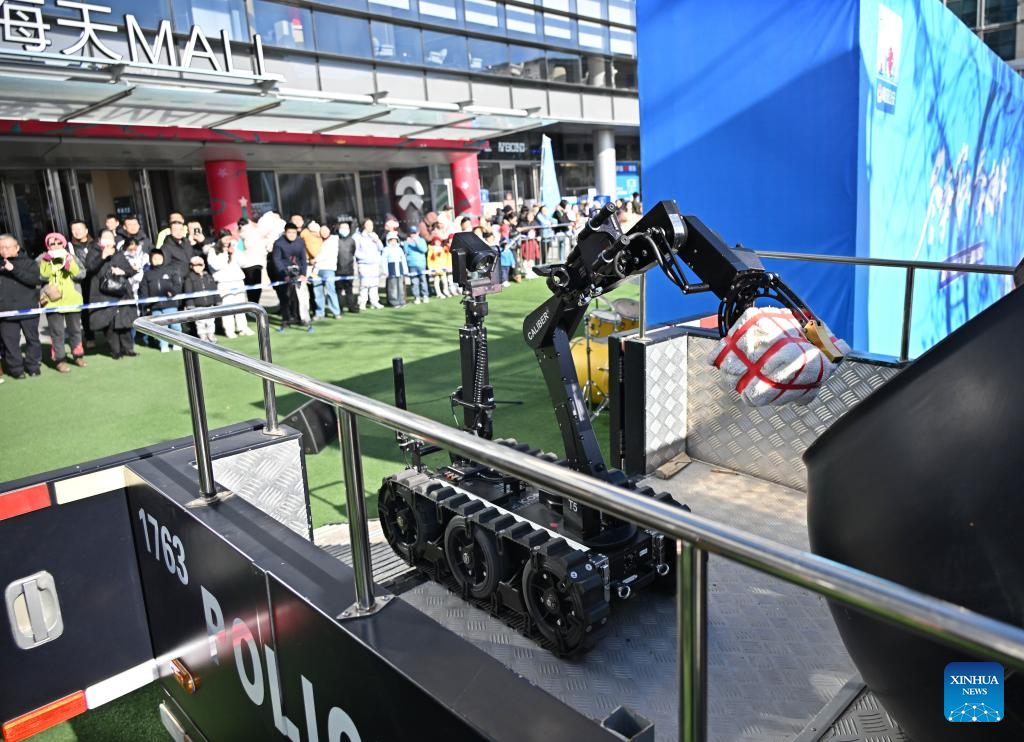 Citizens watch a robot display explosive disposal operation in Qingdao, east China's Shandong Province, Jan. 10, 2026. Various activities were held nationwide to mark the sixth Chinese People's Police Day. (Xinhua/Li Ziheng)