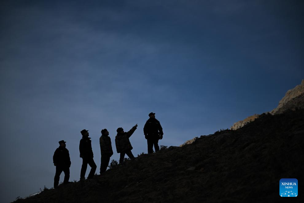 Police officers communicate with rangers during a patrol in the Laohugou region of Menyuan Hui Autonomous County in Haibei Tibetan Autonomous Prefecture, northwest China's Qinghai Province, Jan. 8, 2026. For years, police officers and rangers inside Qilian Mountain National Park in northwest China's Qinghai Province have dedicated themselves to their work, carrying out regular patrols and safeguarding the region's ecological security despite high altitude and harsh winter weather. (Xinhua/Qi Zhiyue)