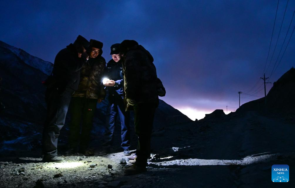 Police officers take a rest during a patrol in the Laohugou region of Menyuan Hui Autonomous County in Haibei Tibetan Autonomous Prefecture, northwest China's Qinghai Province, Jan. 8, 2026. For years, police officers and rangers inside Qilian Mountain National Park in northwest China's Qinghai Province have dedicated themselves to their work, carrying out regular patrols and safeguarding the region's ecological security despite high altitude and harsh winter weather. (Xinhua/Zhang Long)
