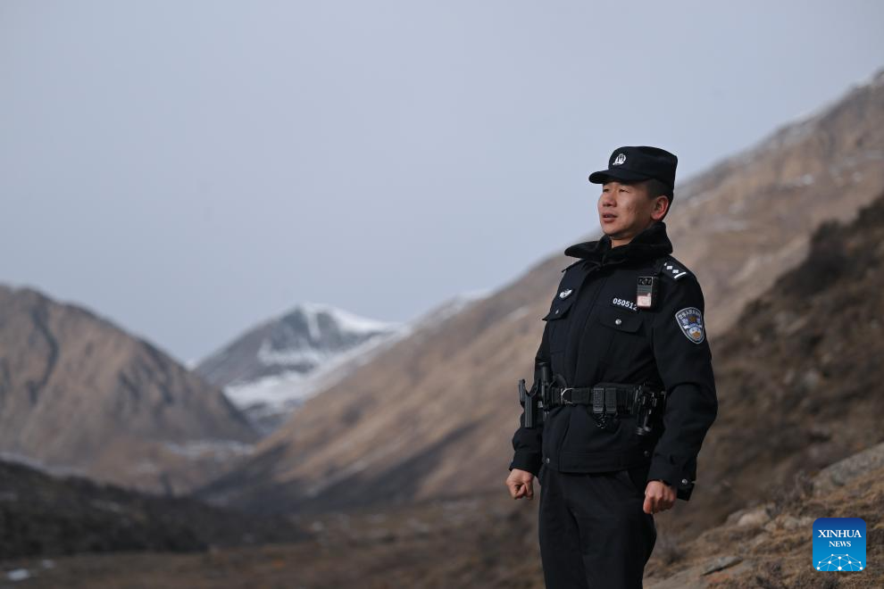 Police officer Guo Jianye observes with a telescope in the Laohugou region of Menyuan Hui Autonomous County in Haibei Tibetan Autonomous Prefecture, northwest China's Qinghai Province, Jan. 9, 2026. For years, police officers and rangers inside Qilian Mountain National Park in northwest China's Qinghai Province have dedicated themselves to their work, carrying out regular patrols and safeguarding the region's ecological security despite high altitude and harsh winter weather. (Xinhua/Zhang Long)