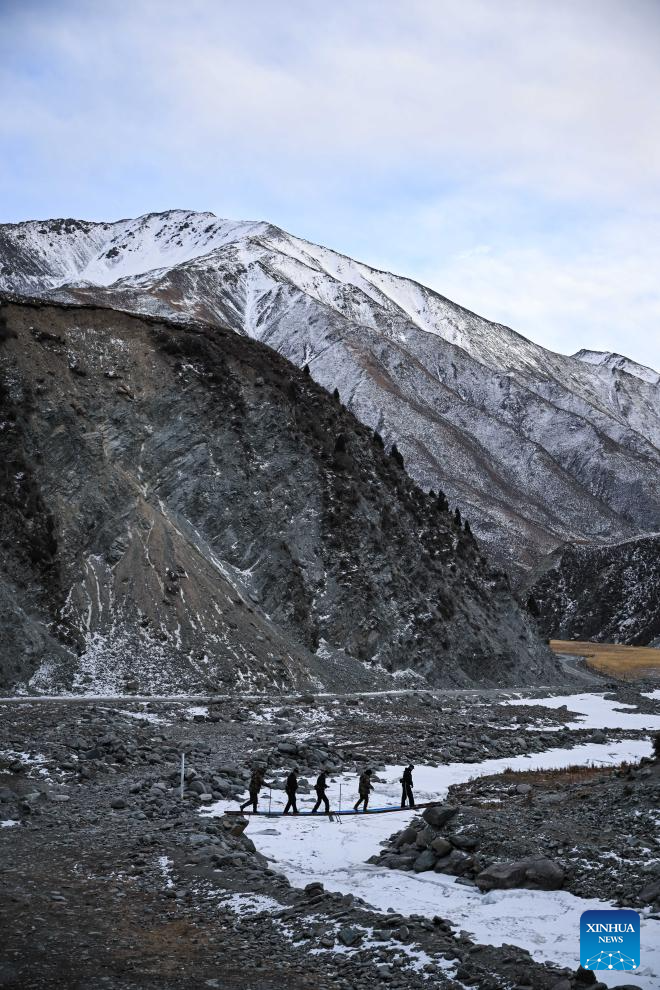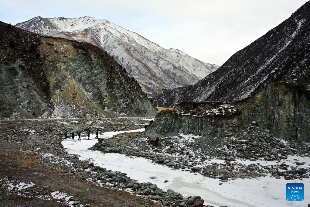 Police officers and rangers patrol the Qilian Mountains in the Laohugou region of Menyuan Hui Autonomous County in Haibei Tibetan Autonomous Prefecture, northwest China's Qinghai Province, Jan. 8, 2026. For years, police officers and rangers inside Qilian Mountain National Park in northwest China's Qinghai Province have dedicated themselves to their work, carrying out regular patrols and safeguarding the region's ecological security despite high altitude and harsh winter weather. (Xinhua/Zhang Long)