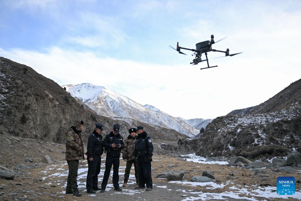 Police officers and rangers use a drone to conduct a patrol in the Laohugou region of Menyuan Hui Autonomous County in Haibei Tibetan Autonomous Prefecture, northwest China's Qinghai Province, Jan. 8, 2026. For years, police officers and rangers inside Qilian Mountain National Park in northwest China's Qinghai Province have dedicated themselves to their work, carrying out regular patrols and safeguarding the region's ecological security despite high altitude and harsh winter weather. (Xinhua/Zhang Long)