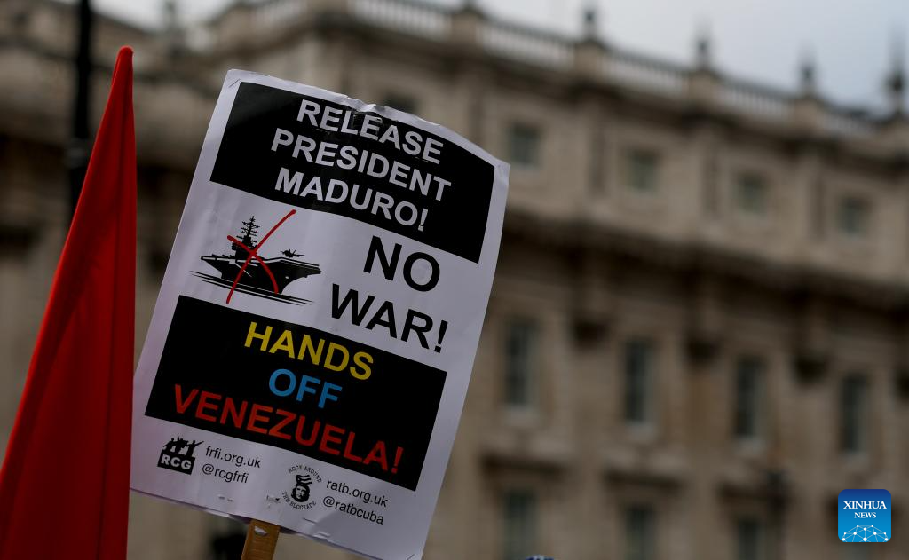 Demonstrators hold placards during a protest condemning U.S. attack on Venezuela outside No. 10 Downing Street in London, Britain, Jan. 10, 2026. (Xinhua/Li Ying)