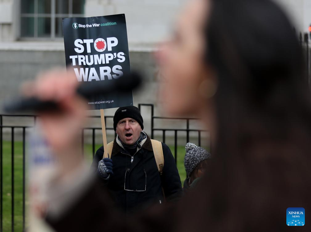 A man holds a placard while listening to a speech during a protest condemning U.S. attack on Venezuela outside No. 10 Downing Street in London, Britain, Jan. 10, 2026. (Xinhua/Li Ying)