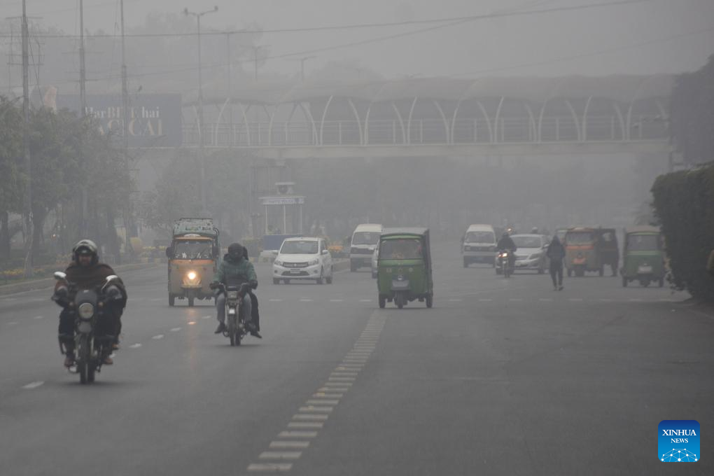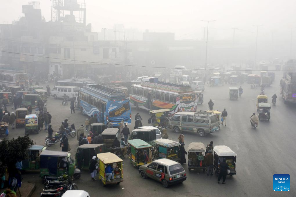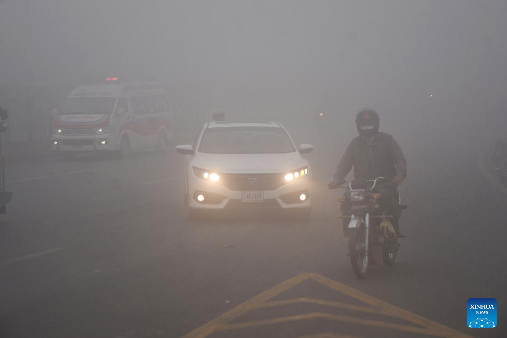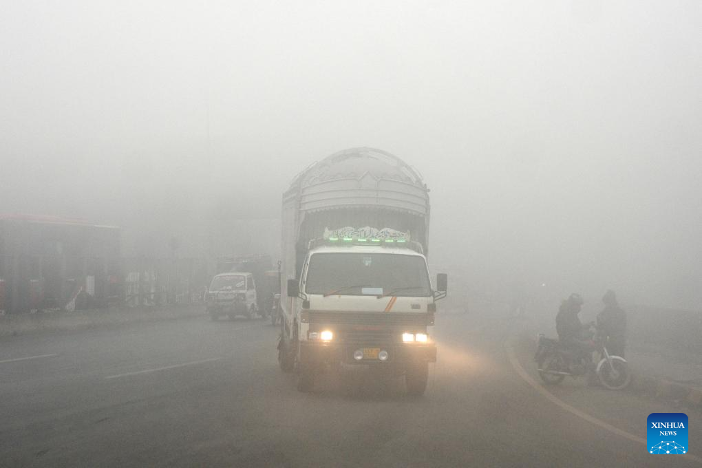 Vehicles move amid dense fog on a road in Lahore, Pakistan, Jan. 11, 2026. (Photo by Sajjad/Xinhua)