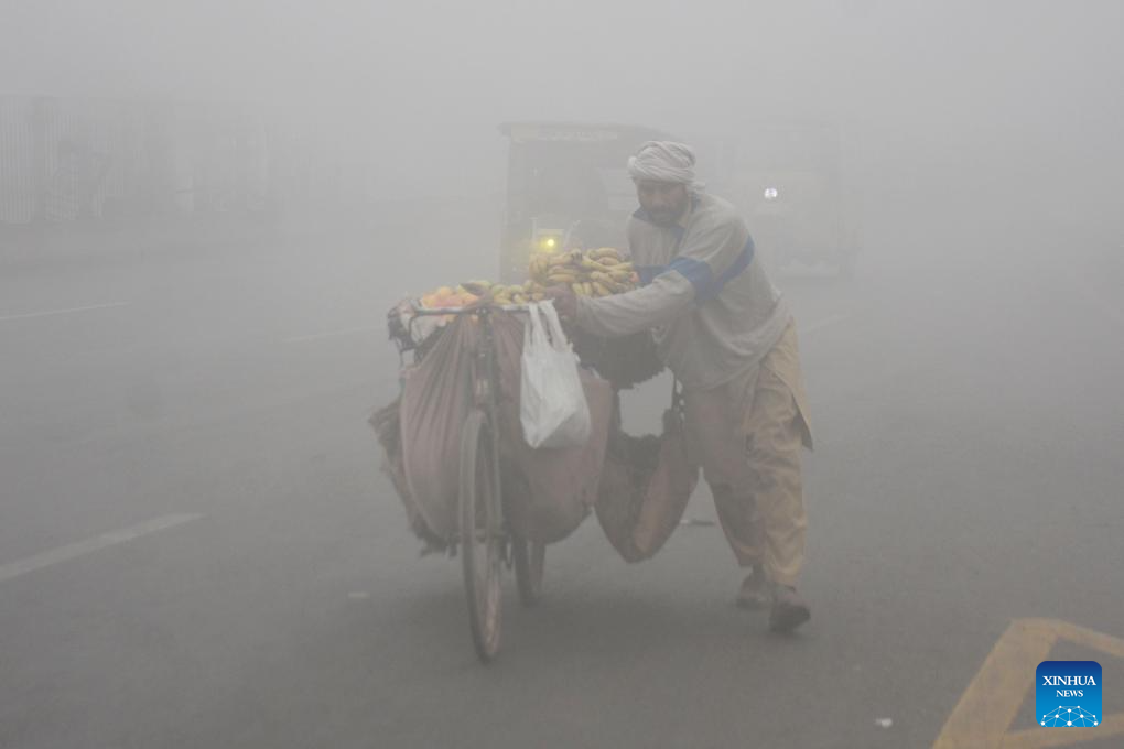 A fruit vendor pushes his bicycle amid dense fog on a road in Lahore, Pakistan, Jan. 11, 2026. (Photo by Sajjad/Xinhua)